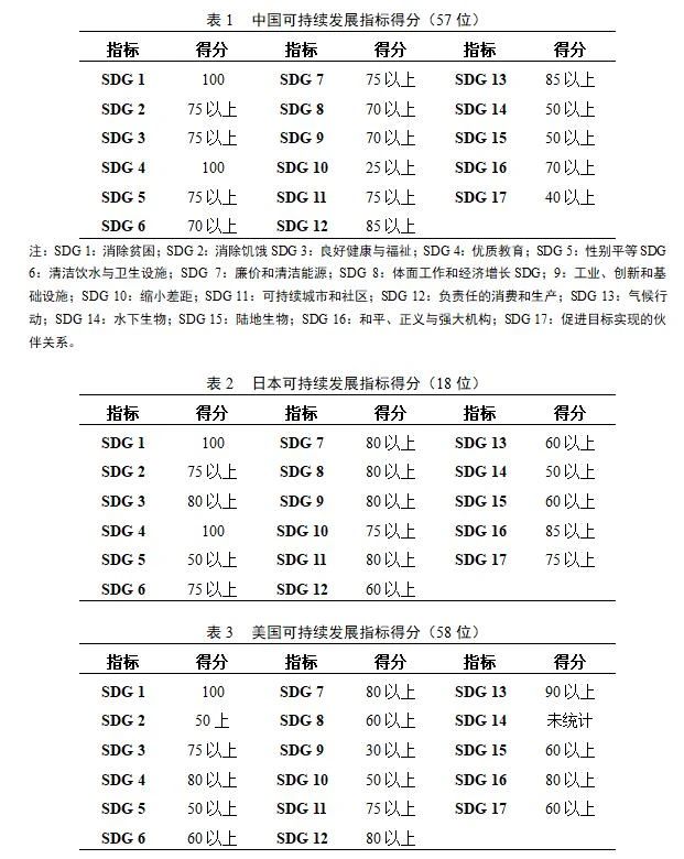 該報告計算了165個國家的可持續(xù)發(fā)展指標得分。其中中國排名第57位。其中17個子目標得分見表1。作為比較,日本和美國的得分分別見表2和表3。