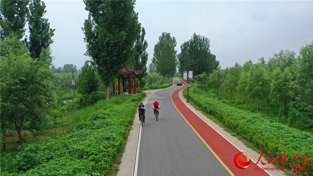 近日,當(dāng)?shù)鼐用裨诤颖笔婵h運(yùn)河堤頂觀光路上騎行。 人民網(wǎng) 袁志廣攝