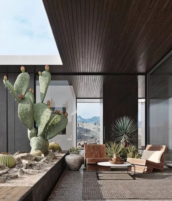除了木石和植物、桌椅家具之外,還可以在室內(nèi)與室外庭院之間,選擇使用一面大大的落地窗。對室內(nèi)而言,不僅增加了空間的采光,而且人們在室內(nèi)也可以坐看花開花落、云卷云舒,同時還不會遭受惡劣天氣的影響,烹煮一杯茶,靜享閑暇愜意的時光,感悟禪意滋味。